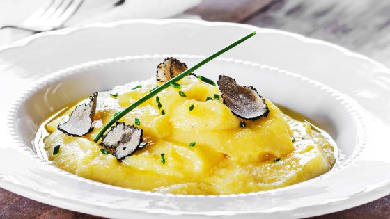 Ingredienti 1/2 kg. di farina di mais bramata 2 l. di acqua 1 cucchiaio di olio extravergine di oliva 200 gr. di formaggio al tartufo 100 gr. di latte 50 gr. di parmigiano reggiano grattugiato 40 gr. di tartufo nero 20 gr. di burro sale e pepe (per 4 persone) Preparazione Iniziate…